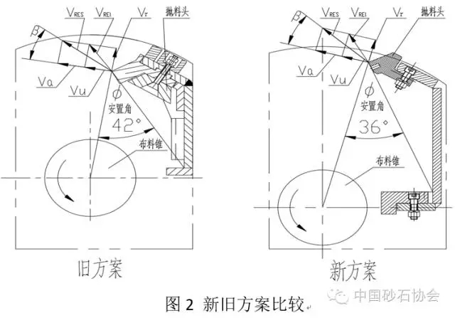 在轉速、葉輪直徑、布料錐大小不變的前提下,著眼于盡可能增大拋射點的半徑Ra,適當調整導料安置角φ,提出了改進方案。新舊方案拋料頭的布置見圖2。