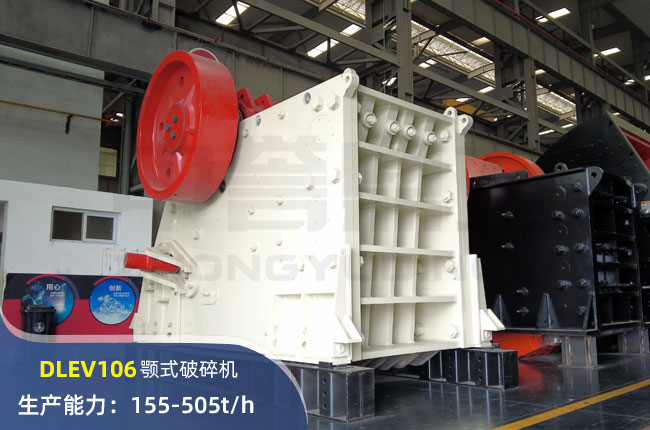 DLEV106鄂式破碎機允許的進料大小為600mm以內,進料口尺寸在1060×700mm,配備電機功率為110kw,生產能力可達500t/h。