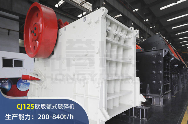 CJ125顎式破碎機(jī)進(jìn)料口尺寸1250×950mm,進(jìn)料粒度760mm,出料大小100-250mm,電機(jī)功率160kw,時(shí)產(chǎn)量可達(dá)840噸。