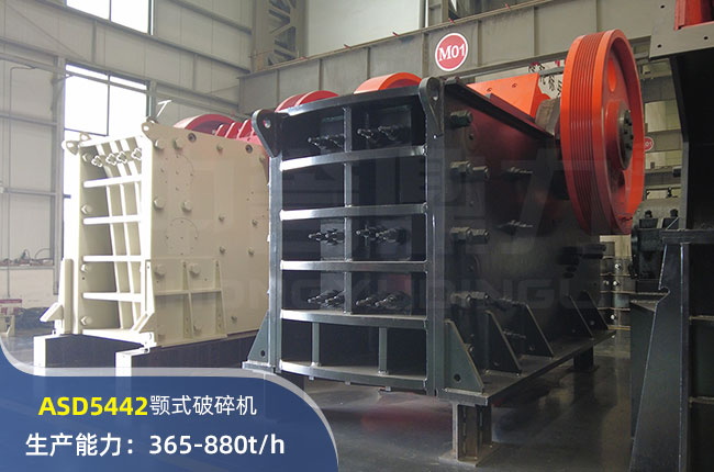 ASD5442顎式破碎機進料口尺寸1370×1070mm,進料粒度≤1020mm,出料大小≤90mm,電機功率185kw,時產量365-880噸左右。
