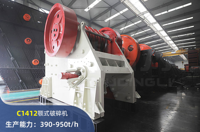 C1412顎式破碎機進料口尺寸1400×1200mm,進料粒度≤1200mm,出料大小≤95mm,電機功率185kw,時產在390-950噸左右。