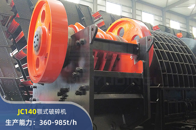 JC140顎式破碎機是一款重量近千噸的一破設備,其進料口910mm,出料大小125mm,時產量在985噸左右。構造緊湊合理,節省占地面積,基礎建設工程花費低。