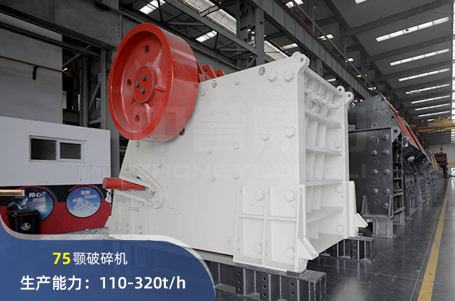 75顎破碎機每小時的處理范圍是110-320噸,給料口的尺寸大小為750×1060mm, 排料口處理范圍80-140mm, 配備電機功率是8P 110kw。