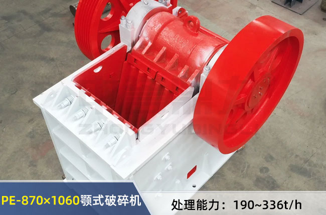 PE-870×1060顎式破碎機進料尺寸是870×1060mm,進料口寬大,可通過粒度≤660mm的礦石物料,每小時的處理能力在190-336噸,排料口調整范圍200-260mm。