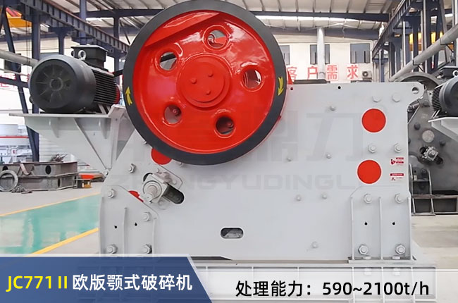 JC771II歐版顎式破碎機(jī)進(jìn)料口大小1800×1500mm,這里1800指進(jìn)料口寬,1500mm指進(jìn)料口深度,設(shè)備出料調(diào)節(jié)范圍在150-400mm,每小時(shí)產(chǎn)量在590-2100噸,電機(jī)功率為315-400kw,采用電機(jī)與主機(jī)一體式設(shè)計(jì),可節(jié)省占地面積。