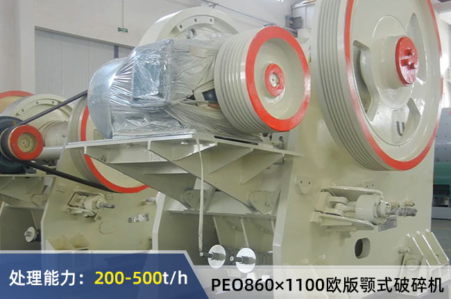 PEO860×1100歐版顎式破碎機進料口尺寸860×1100mm,進料粒度在720mm以下,配置電機功率為132-160kw,時產量在200-500噸,出料范圍100-225mm,重量32噸左右。