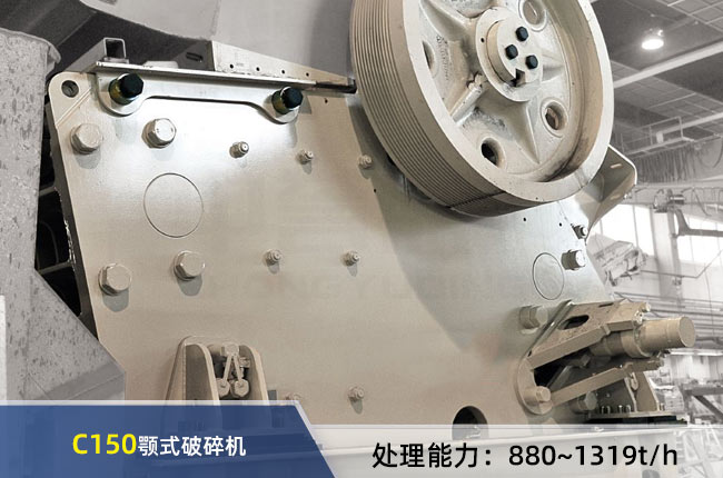 c150破碎機是型號為C150鄂式破碎機,進料口寬度是1400mm,深1200mm,排料口允許調整的范圍125-250mm,每小時產能800~1319噸之間,可滿足中大型砂石廠生產需求。