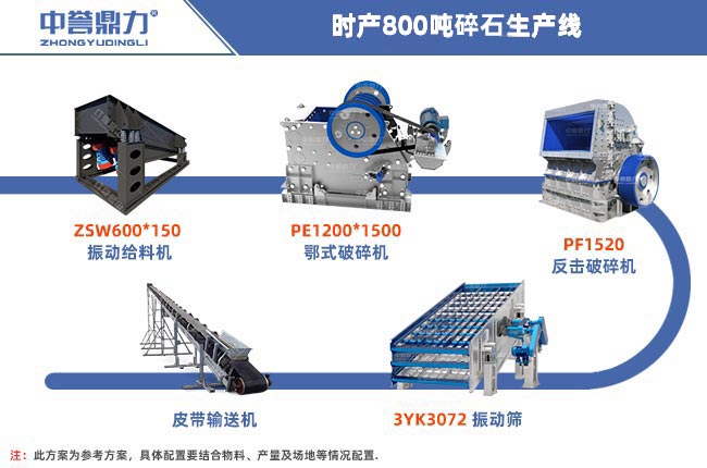 配置時產800到1000噸的生產線要用到破碎設備、給料設備、篩分設備、輸送設備等,如果制砂的話還要配上制砂設備、洗沙設備以及除塵設備等,根據用戶需求的不同,生產線搭配也比較靈活,時產800到1000噸碎石生產線常見配置有以下幾種: