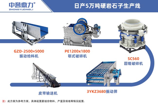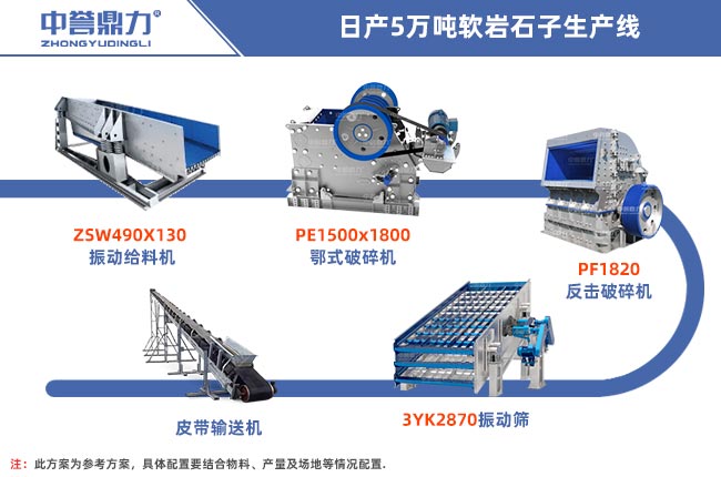 日產5萬噸碎石投資方案設備搭配比較靈活,可以根據自己的物料屬性、資金狀況進行合理選擇,下面以兩種常見的軟巖(石灰石、青石等)處理方案和硬巖(鵝卵石、花崗巖等)處理方案為列: