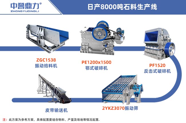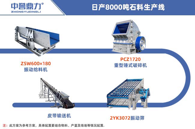 日產8000噸石料生產線需要用到的設備有:給料設備、破碎設備、篩分設備和輸送設備,時產量大概是1000噸左右,常見配置方案有以下幾種,處理軟巖的配置方案、處理硬巖的配置方案,重錘破配置方案以及移動式生產配置方案。