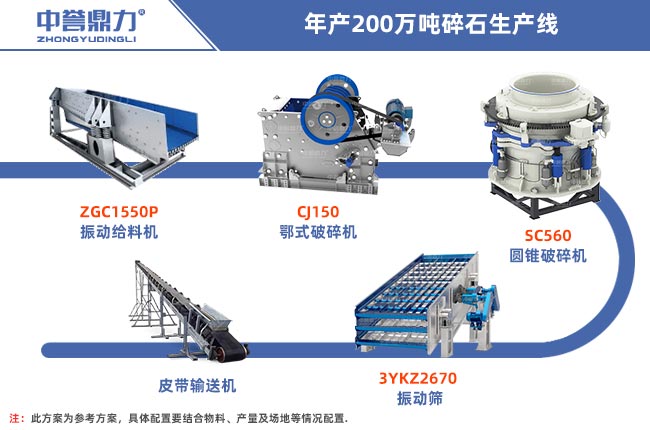 年產200萬噸碎石投資方案可以從物料硬度大小進行配置,比如硬度小的物料我們稱之為軟巖,如石灰石、青石這些都是軟巖,硬度大的物料我們稱之為硬巖,如花崗巖、鵝卵石等物料,在配置方案時要根據物料硬度進行設備的選擇,這兩條生產線的投資都在五六百萬左右,實際價格會有差異,下面給大家列舉兩條生產線搭配方案,僅供參考。