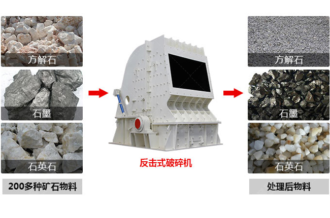 反擊破作業時,在電動機的驅動下,轉子高速運動,物料進入板錘作用區時,與轉子上的板錘沖撞粉碎,后又被拋向反擊系統上重新粉碎,接著又從反擊板上彈回到板錘作用區重新粉碎,此工序反復做出,物料由大到小進入一、二、三、反擊腔反復做出粉碎,直到物料被粉碎到 所需粒度,由排礦口排出。