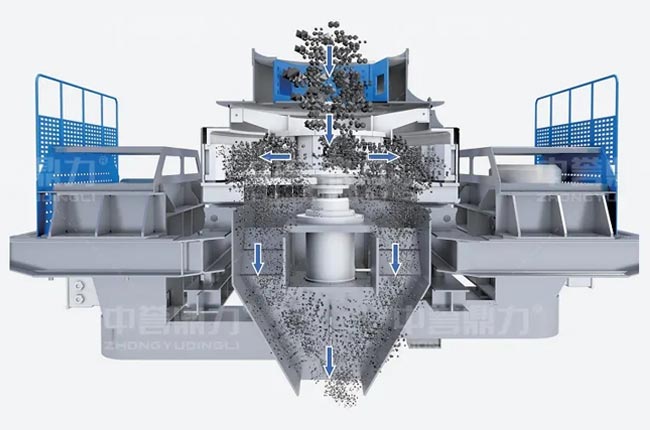 立式打砂機(jī)是中心進(jìn)料,進(jìn)料口在設(shè)備頂部,物料從進(jìn)料口進(jìn)入通過葉輪旋轉(zhuǎn)將物料拋出,實(shí)現(xiàn)石打石或石打鐵的破碎方式。