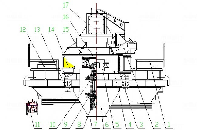 立軸沖擊式制砂機內部結構包含主軸總成(8)、出油口(9)、進油口(10)、周護板(14)、葉輪裝置(15)、分料盤(16)等組成,具體可參考以下立軸沖擊式制砂機分解圖。