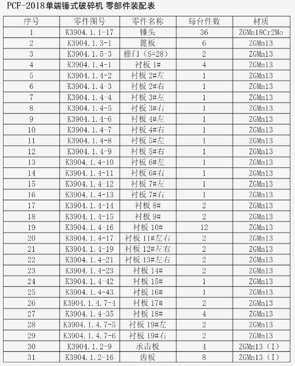 2018單段錘式破碎機多少個錘頭? 匿名用戶提問于:2022-08-09 14:14:09 2018單段錘式破碎機有36個錘頭,采用ZGMn18Cr2Mo材質(zhì),即高錳鋼錘頭。 該回答是否解決您的問題是否 溫馨提示:如果上述問題和您的問題不同,可在線咨詢技術(shù)人員咨詢技術(shù) 工程師回答 2018單段錘式破碎機有36個錘頭,錘頭材質(zhì)為ZGMn18Cr2Mo,即高錳鋼錘頭。在實際使用中錘頭磨損到原來重量的60%時,應(yīng)及時更錘頭,避免對產(chǎn)量造成影響。PCF-2018單端錘式破碎機技術(shù)參數(shù)進料口尺寸2828×2480mm進料粒度<1000mm轉(zhuǎn)子回轉(zhuǎn)速度300r/min出料粒度≤25mm生產(chǎn)能力350-500t/h電機功率630-710kw 中譽鼎力張工擅長 選型 工藝配置穩(wěn)妥回答 還沒有符合您的答案?快速電話咨詢 咨詢電話:400-700-2111 提交問題,3分鐘快速解答 咨詢設(shè)備: 請選擇您想咨詢的設(shè)備 錘式破碎機 鄂式破碎機 反擊式破碎機 旋回破碎機 振動篩 給料機 其它礦山設(shè)備 怎么稱呼: 聯(lián)系電話: 快速解答12761條問題已在線解答我要提問3-15分鐘獲得快速解答