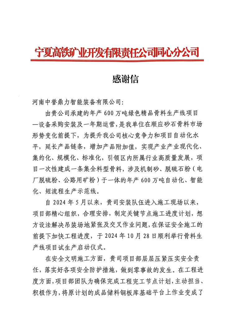 新春前夕,中譽鼎力迎來了一份的新年禮物——寧夏高鐵同心分公司的感謝信和錦旗。感恩客戶對我們過去一年工作的高度認可,新的一年,愿與所有客戶及企業同仁攜手共進,披荊斬棘,續寫高質量發展華彩新篇。