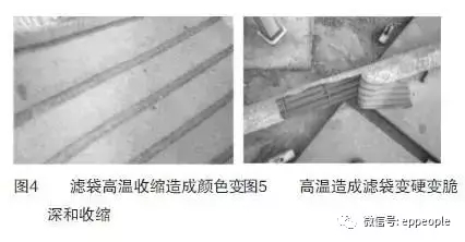 高溫煙氣對濾袋的另外一種損害是高溫收縮,雖然每種濾料的使用溫度不同,但當煙氣溫度過其使用溫度后,如其經向收縮率過大,會使濾袋在長度方向上尺寸變短,濾袋袋底緊托著骨架并受力而損壞(如圖3)。如果濾袋緯向熱收縮過大,將使濾袋在徑向尺寸變小,濾袋會緊緊箍在骨架上,甚至無法抽出骨架。從而使濾袋處于受力狀態,造成濾袋的收縮變形、變硬、變脆,加快強度耗損、減短濾袋壽命。由于濾袋變形后會緊緊箍在骨架上,在清灰時濾袋難以變形而不利于噴吹清灰,導致濾袋阻力居高不下。