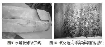 纖維氧化是纖維中分子失去(或離解)電子的過程,如PPS纖維,在高溫(150℃)條件下氧分子攻擊分 子中的“S”,并與之結合。造成PPS纖維變色、變硬、 變脆,強度而破損,嚴重時纖網會破碎而脫離基布 (如圖10)。氧化是濾袋損壞的又一主要因素。抗氧化 性能較差的濾料主要有:聚丙烯、聚苯硫醚(PPS)等。