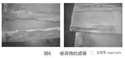 腐蝕是濾袋損壞的常見的原因之一,由于煙氣中含有多種腐蝕性物質,且在高溫環境下腐蝕作用更大,從而會造成濾袋損壞。產生腐蝕的主要原因有水解、氧化、酸、堿腐蝕。其中主要以水解、氧化原因造成損壞較多,而酸腐蝕較少,堿腐蝕則更少。