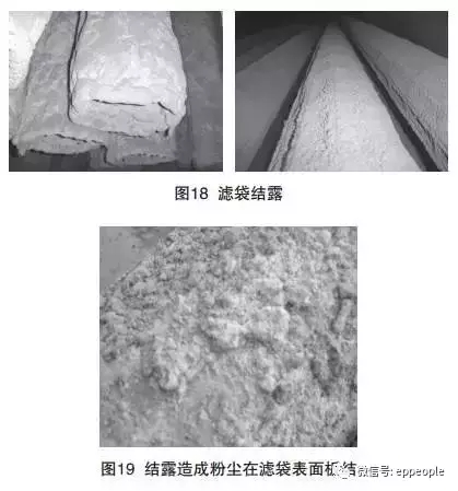 結露是袋式除塵器運行中常見問題(如圖18), 水分是濾袋結露的大原因,造成濾袋含有水分的原因 通常是低溫發生凝露,尤其在處理燃燒或高溫煙氣時,當濾袋表面的初始粉塵層含有水分,干燥后就會使粉塵 凝結、板結(如圖19)。