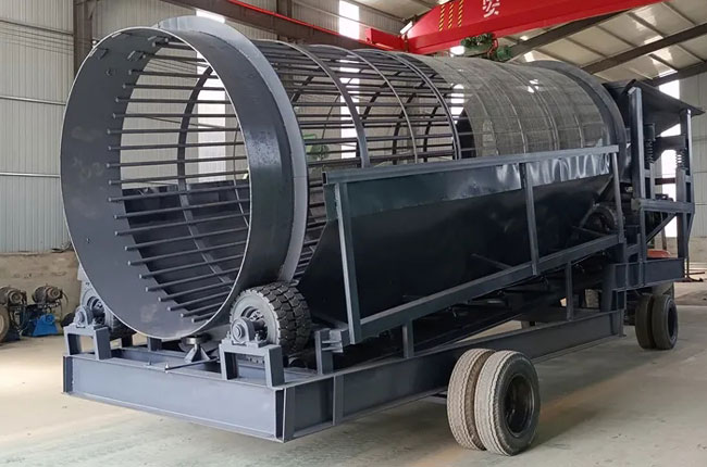 移動滾筒篩石機是將傳統滾筒篩石機安置再有輪子的機架上,可以自由移動、轉場,在市面上又叫移動滾筒篩分機、移動式滾筒篩、籠式滾筒篩等。