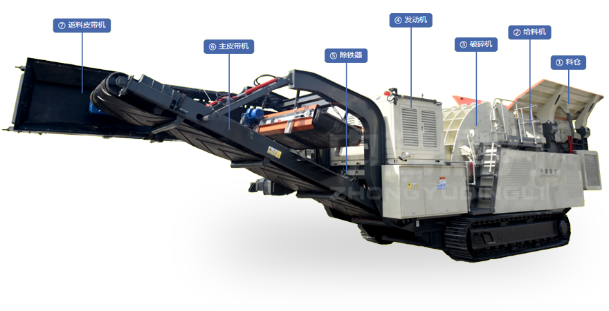 ⑦返料皮帶機將篩分履帶站的頭層物料輸送到破碎機