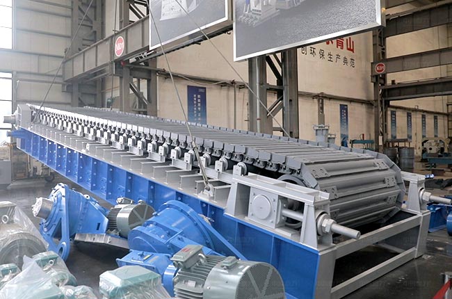 板式給料機的組成部分包括機架、主軸裝置、驅動裝置(電動機、聯軸器、減速器)、鏈板裝置、拉緊裝置、支重輪、托鏈輪等。