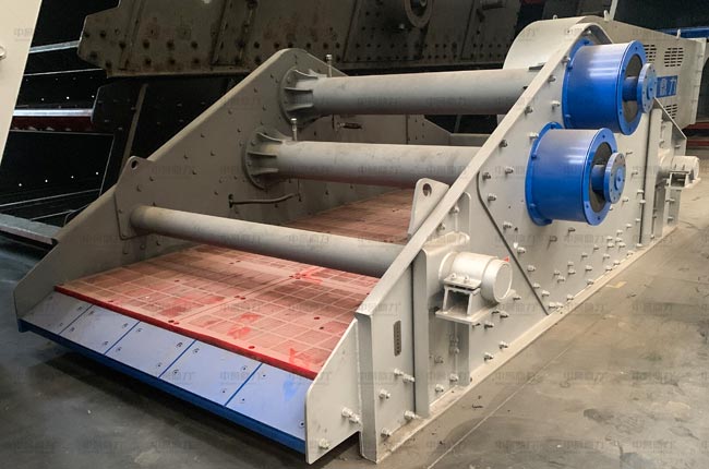 主要由篩箱、箱式激振器、支撐系統(tǒng)及電機(jī)組成,通過膠帶聯(lián)軸驅(qū)動(dòng)箱式激振器,箱式激振器內(nèi)部齒輪作同步反向運(yùn)轉(zhuǎn),兩組偏心質(zhì)量產(chǎn)生的離心力沿振動(dòng)方向的分力疊加,反向離心抵消,從而形成單一的沿振動(dòng)方向的激振動(dòng),使篩箱做往復(fù)直線運(yùn)動(dòng)。