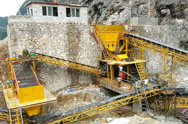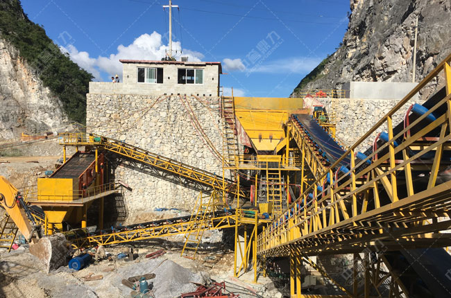 該項目2016年開始建設,是一條時產500噸的石料生產線,主要破碎石灰石,成品石料供樂業到百色高速公路用料。我公司為其設計主機使用的是PCZ1615重錘破、1550給料機、3070振動篩。