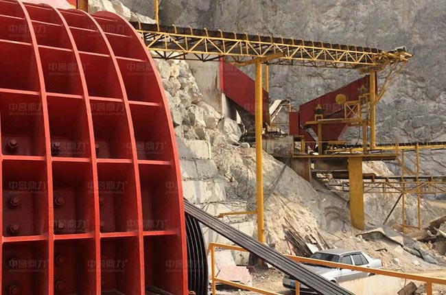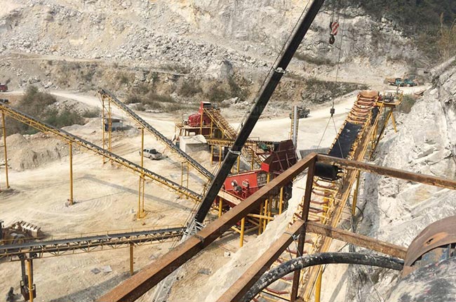 原石料通過卸料倉,由棒條式給料機對原料進行預處理,篩下的石料通過振動篩篩選,反擊破細碎,再次篩分,其余大規格的骨料通過給料機均勻連續送進1615重錘破破碎,直接通過振動篩篩分,部分大規格石料會經過反擊破二次加工,其余混合料通過振動篩篩分不同規格的石料。