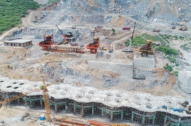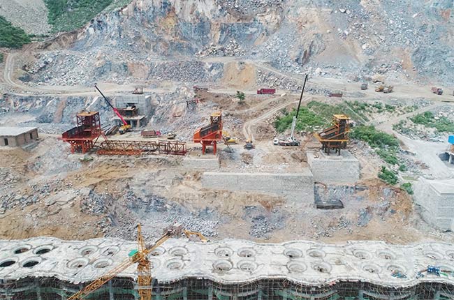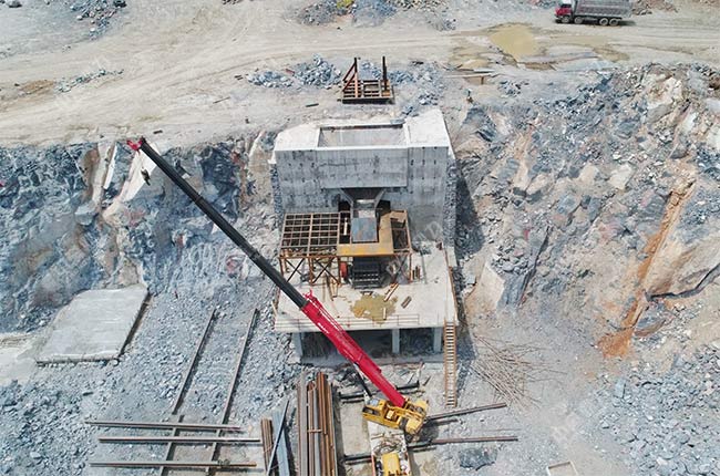 上面是項目在建設過程中的實拍圖片,破碎機、給料機、振動篩等主要設備都已經安裝完成,料倉的基礎也已經建好。