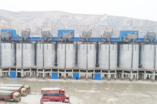 這是項目建成投產后的現場照片,各個生產設備都已做好環保措施,生產中沒有揚塵污染,生產出來的成品料經過篩分后都儲藏在相對應規格的料倉里,便于出售。