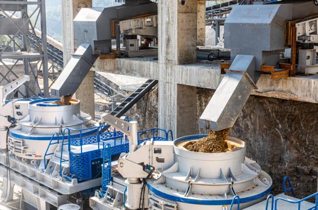 加工區生產流程:ZGC2050給料機→PCZ1820破碎機→長皮帶→中間倉→ZG1223給料機→HCS1523反擊破碎機→2YKZ3680S振動篩分→VSI1263沖擊破→ZG1223給料機→3YKZ3680S篩分機→米石緩沖倉→ZG1223給料機→VSI1263立式沖擊破→2YKZ3070S振動篩→料倉。