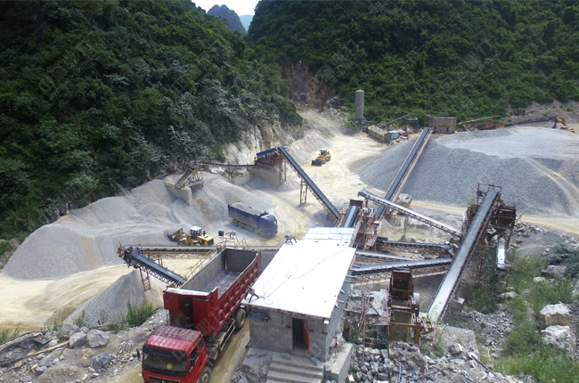 設備方案:ZSW490×110震動喂料機、PE750×1060鄂破機、GYS400圓錐式破碎機、3YK2870篩機。