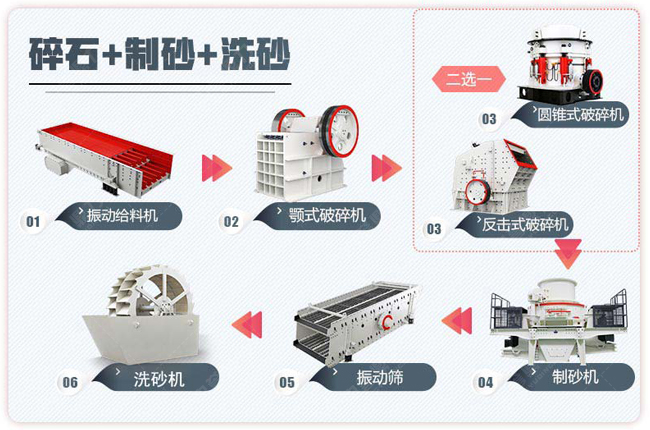 把礦石粉碎成砂石,需要配置初碎、二段破碎、整型破碎機(jī)械,再配置喂料、篩選分級(jí)、傳送機(jī)械,構(gòu)成一條骨料線,加工環(huán)節(jié)配置如下: