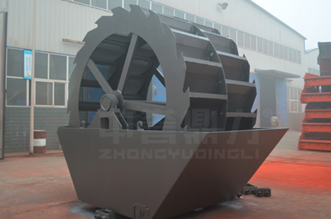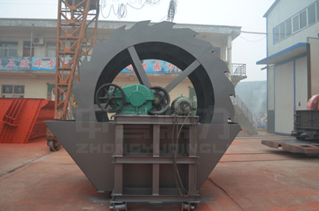 工作時,在電機的帶動下三角帶、減速機、齒輪減速后帶動葉輪進行轉動,石粉物料由給料槽進入洗槽中,在葉輪帶動下翻滾,等除去石粉表面雜質后完成清洗,從溢出口洗槽排出。干凈的石粉由葉片帶走,然后砂石從旋轉的葉輪倒入出料槽。