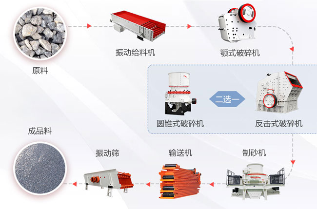 大型:喂料機(jī)+顎破機(jī)(初級(jí)破碎)+圓錐石子機(jī)(二破)+制砂機(jī)械+洗石機(jī)(選配)+篩機(jī)