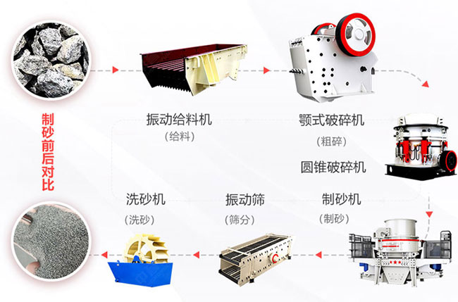 震動喂料機將片麻巖傳送至pe顎式破碎機做出粗碎,再由傳送機運至圓錐破碎機做出中整型破碎,整型破碎后的石料進振動篩分機篩選分級出三種大小不一樣的石子、毛石,粒度小的進入制砂機做出整形制砂,塊度較大的重新進入pe顎式破碎機或許圓錐破碎機做出二次粉碎,來回循環(huán),能夠打造多種規(guī)格粒度大小的砂石成品。