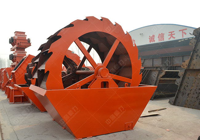 1、輪斗式石粉洗沙機械:輪斗式石粉洗沙機械外觀像一個車輪置于洗選槽中,有單葉輪、雙葉輪之分,號的輪斗寬度為3500毫米,該機械洗砂效率高,人工砂流失少。