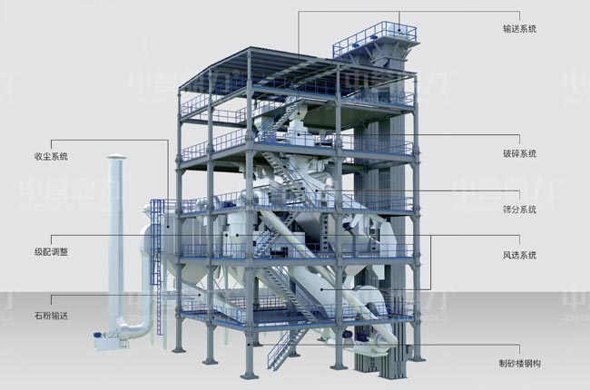中譽鼎力樓式制砂機組成結(jié)構(gòu)有全封閉皮帶機、立軸式?jīng)_擊式制砂機、振動篩、風選設(shè)備、收塵器、脈沖袋式除塵器、拌濕機、閉路循環(huán)風選系統(tǒng)、開路風選系統(tǒng)組成。