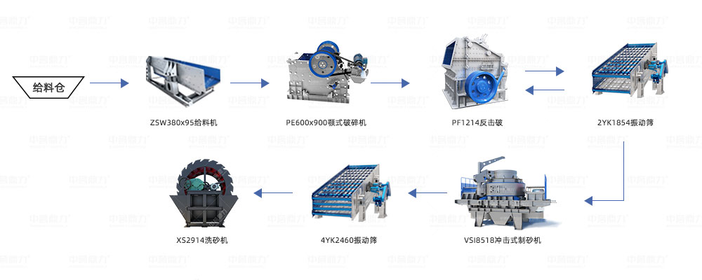 河卵石品質堅硬,經過破碎制砂后粒度、級配等符合機制砂的要求,是機制砂原料的較好選擇。破碎機制砂要一般要經過粗碎、中細碎、制砂、篩分、可選洗砂等幾道工序,一般根據產能需求有多種配置方案。以時產100噸的河卵石制沙機生產線為例,下文就河卵石制沙設備配置方案進行具體介紹。