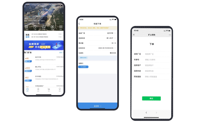 客戶可根據需求利用礦山易購app、微信小程序等平臺進行自助下單,企業可根據散料自動裝車系統可視化交互界面進行訂單查詢、派車、車輛狀態查詢、報表查詢等。